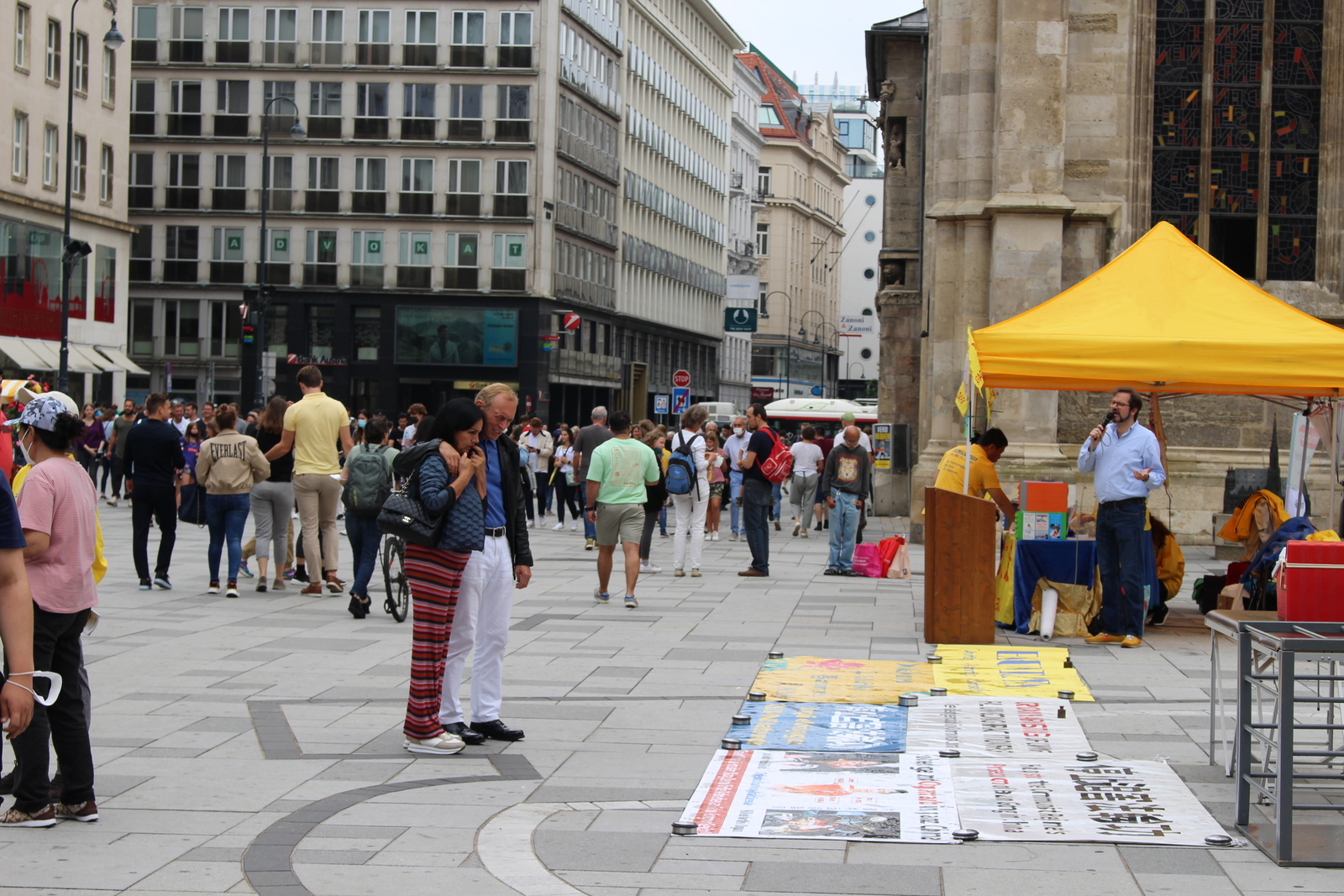 Anlässlich des 22. Jahrestages der Verfolgung von Falun Dafa in China veranstalteten österreichische Falun-Dafa-Praktizierende eine Kundgebung am 17. Juli 2021 am Wiener Stephansplatz. Für Pressezwecke honorarfrei abzudrucken. Copyright © FDI Österreich 2021